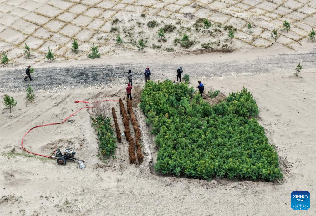 TONGLIAO, 20 abril, 2026 (Xinhua) -- Vista aérea tomada con un dron el 19 de abril de 2026 de trabajadores transportando plantones en el área de un proyecto contra la desertificación, en la bandera trasera del ala izquierda de Horqin de la ciudad de Tongliao, en la región autónoma de Mongolia Interior, en el norte de China. El área arenosa de este proyecto abarca casi 3.000 mu (200 hectáreas), lo que la convierte en la última zona de terreno arenoso móvil y semimóvil que se va a tratar en la bandera trasera del ala izquierda de Horqin. (Xinhua/Lian Zhen)