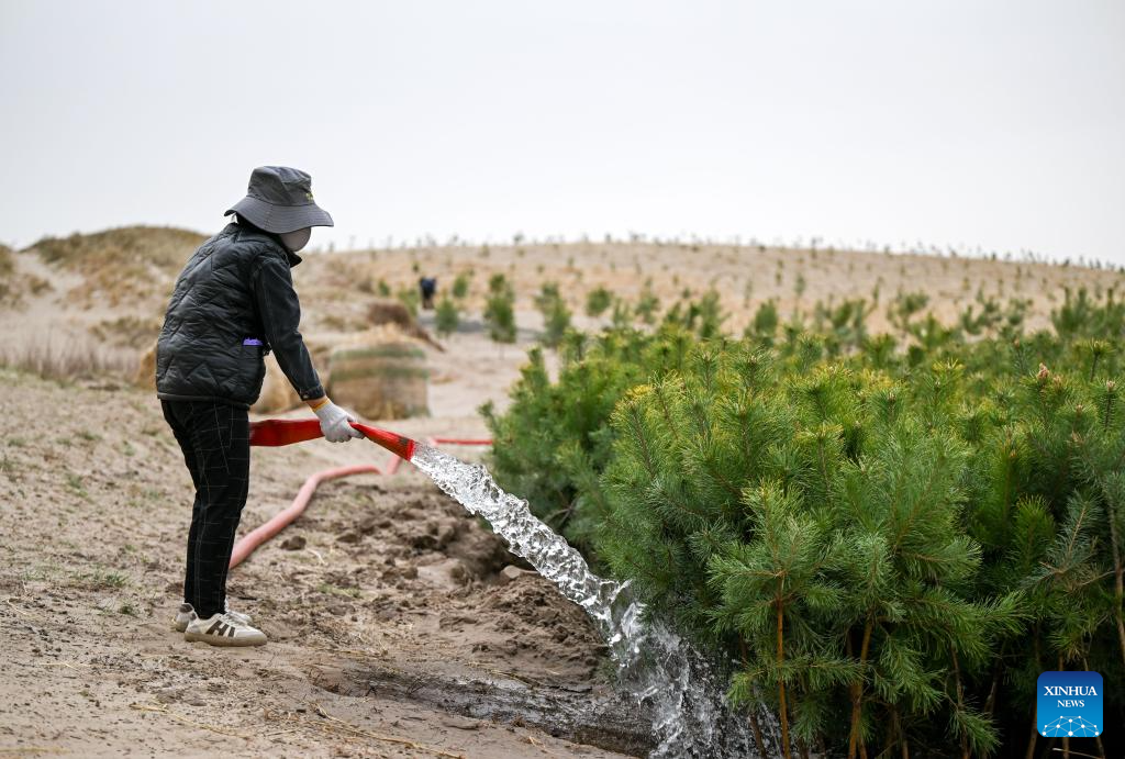 TONGLIAO, 20 abril, 2026 (Xinhua) -- Imagen del 19 de abril de 2026 de un trabajador regando árboles en una área de un proyecto contra la desertificación, en la bandera trasera del ala izquierda de Horqin de la ciudad de Tongliao, en la región autónoma de Mongolia Interior, en el norte de China. El área arenosa de este proyecto abarca casi 3.000 mu (200 hectáreas), lo que la convierte en la última zona de terreno arenoso móvil y semimóvil que se va a tratar en la bandera trasera del ala izquierda de Horqin. (Xinhua/Lian Zhen)
