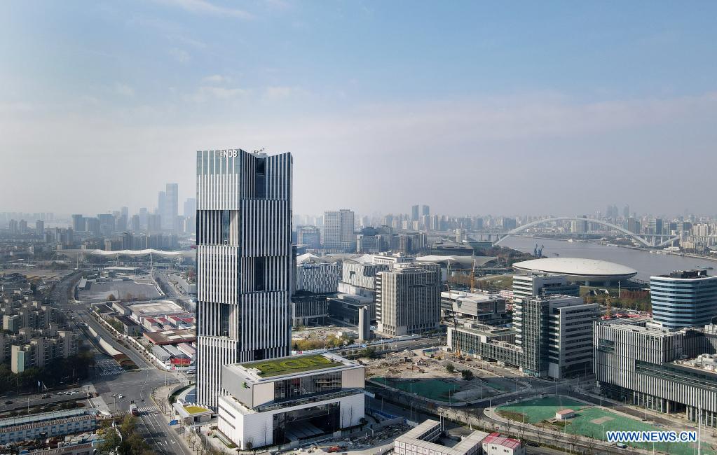 Vista aérea del 17 de diciembre de 2020 del edificio de la sede del Nuevo Banco de Desarrollo (NBD) del grupo BRICS, en Shanghai, en el este de China. El NBD del grupo BRICS anunció el jueves al mediodía que agregará a los Emiratos Arabes Unidos, Uruguay y Bangladesh como sus miembros más recientes. (Xinhua/Fang Zhe)