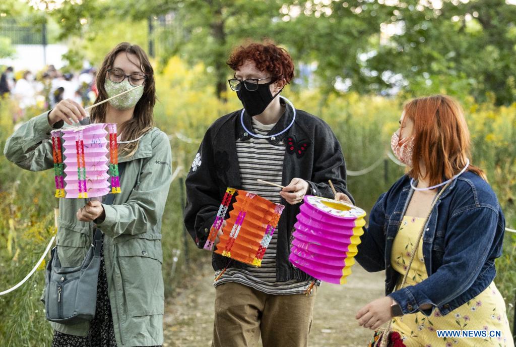 CHICAGO, 19 septiembre, 2021 (Xinhua) -- Imagen del 18 de septiembre de 2021 de visitantes sosteniendo linternas de papel en un parque, en Chicago, Estados Unidos. Con el Festival de Medio Otoño chino acercándose, el Distrito de Parques de Chicago organizó un evento para celebrar el festival. (Xinhua/Joel Lerner)