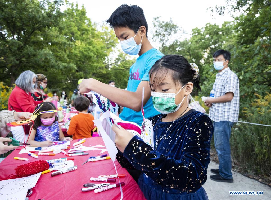 CHICAGO, 19 septiembre, 2021 (Xinhua) -- Imagen del 18 de septiembre de 2021 de visitantes haciendo máscaras con forma de conejo en un parque, en Chicago, Estados Unidos. Con el Festival de Medio Otoño chino acercándose, el Distrito de Parques de Chicago organizó un evento para celebrar el festival. (Xinhua/Joel Lerner)