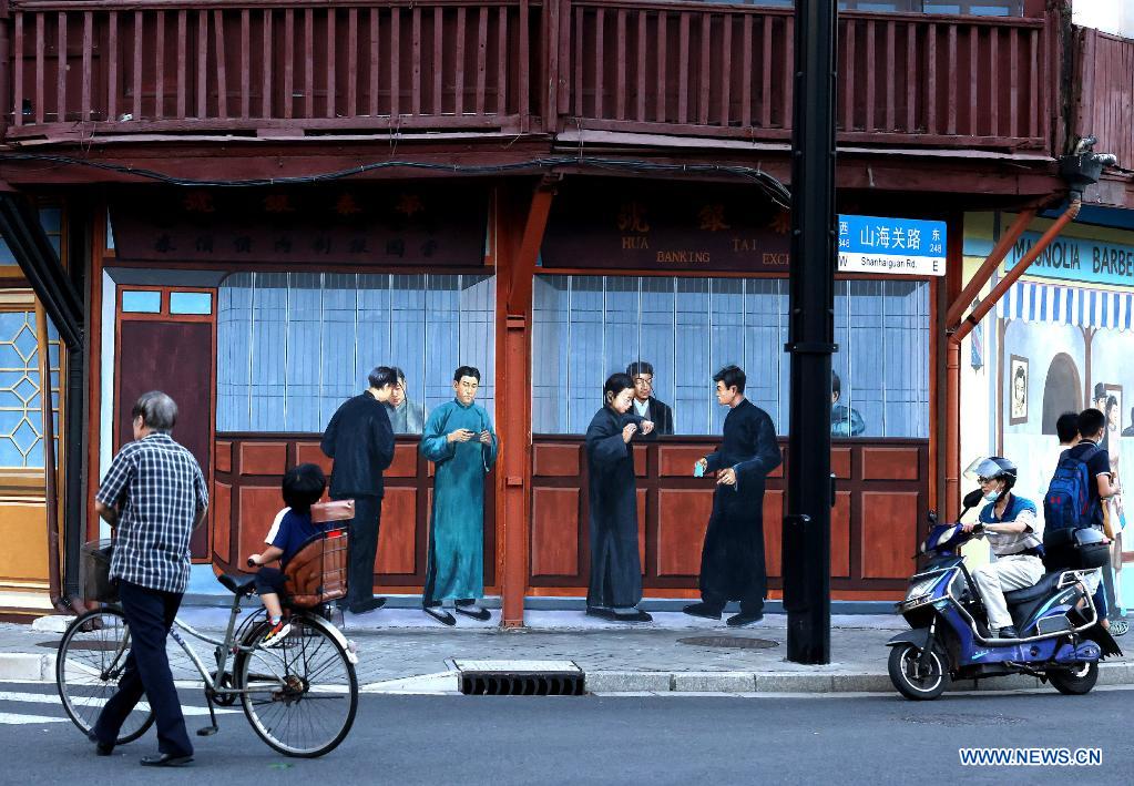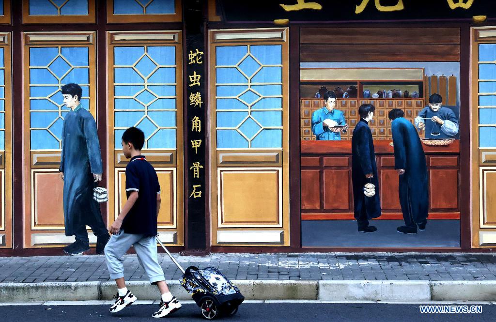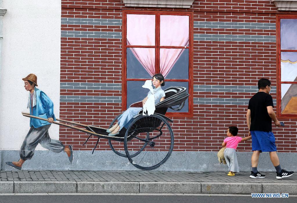 SHANGHAI, 19 septiembre, 2021 (Xinhua) -- Personas caminan frente a una pintura mural representado la vida en un pequeño callejón en una antigua área residencial, en Shanghai, en el este de China, el 19 de septiembre de 2021. (Xinhua/Chen Fei)