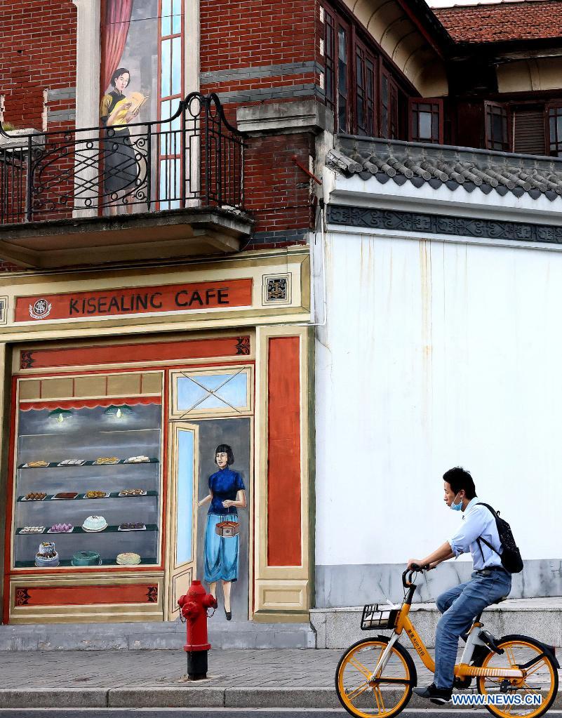 SHANGHAI, 19 septiembre, 2021 (Xinhua) -- Un hombre monta una bicicleta frente a una pintura mural representado la vida en un pequeño callejón en una antigua área residencial, en Shanghai, en el este de China, el 19 de septiembre de 2021. (Xinhua/Chen Fei)