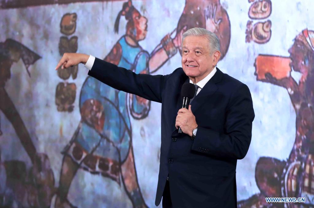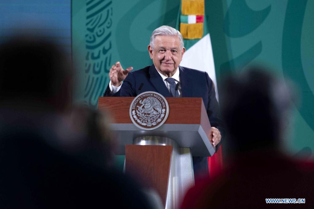 El presidente mexicano, Andrés Manuel López Obrador, participa en su conferencia de prensa matutina, en Palacio Nacional, en la Ciudad de México, capital de México, el 14 de octubre de 2021. La Organización Mundial de la Salud debe acelerar la aprobación de las vacunas contra la enfermedad del nuevo coronavirus (COVID-19) que han mostrado su eficacia y al margen de los intereses políticos, reiteró el jueves López Obrador. (Xinhua/Str)