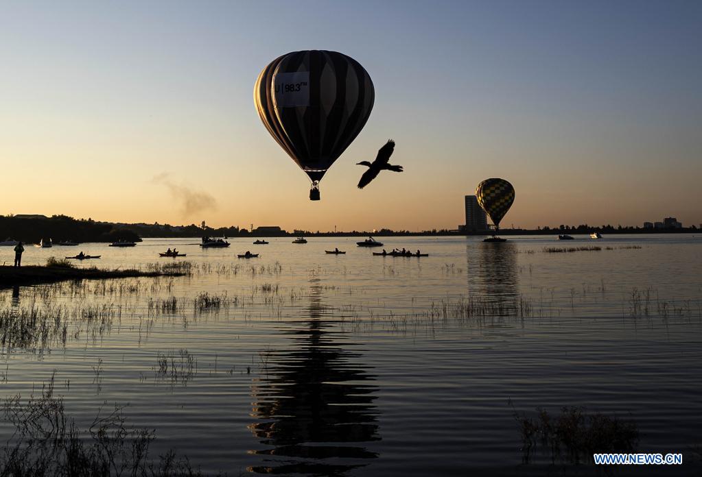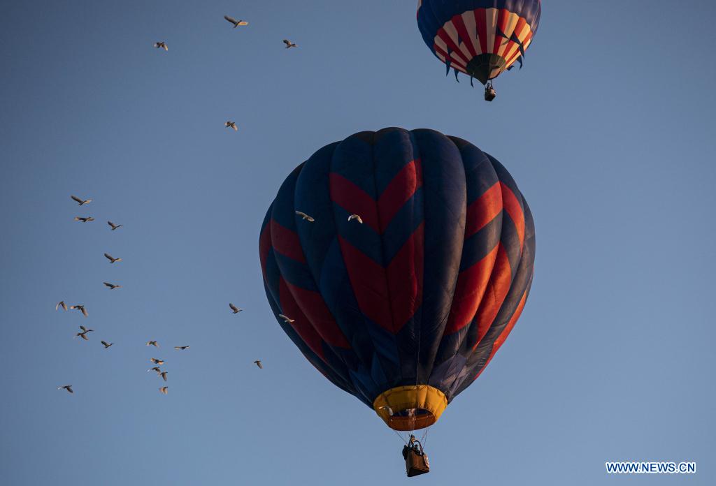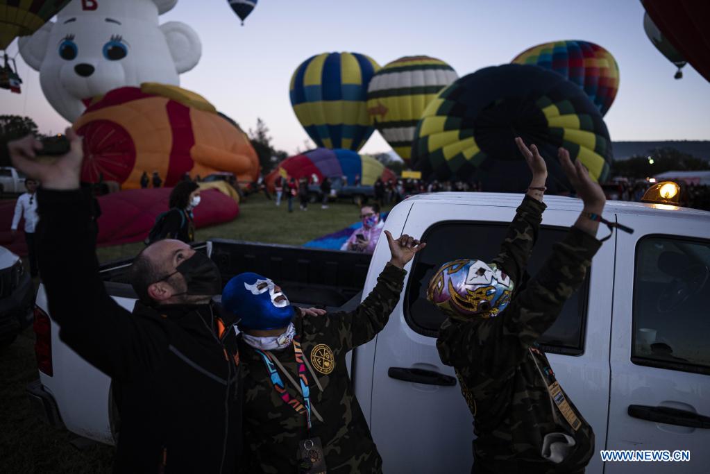 GUANAJUATO, 14 noviembre, 2021 (Xinhua) -- Globos aerostáticos vuelan durante el tercer día de la 20 edición del Festival Internacional del Globo 2021, en León, en el estado de Guanajuato, México, el 14 de noviembre de 2021. Unos 200 globos aerostáticos surcan desde el viernes, y hasta el próximo lunes, el cielo de la ciudad de León, Guanajuato, un espectáculo abierto al público, tras un año suspendido a causa de la pandemia de la enfermedad del nuevo coronavirus (COVID-19). (Xinhua/David de la Paz)