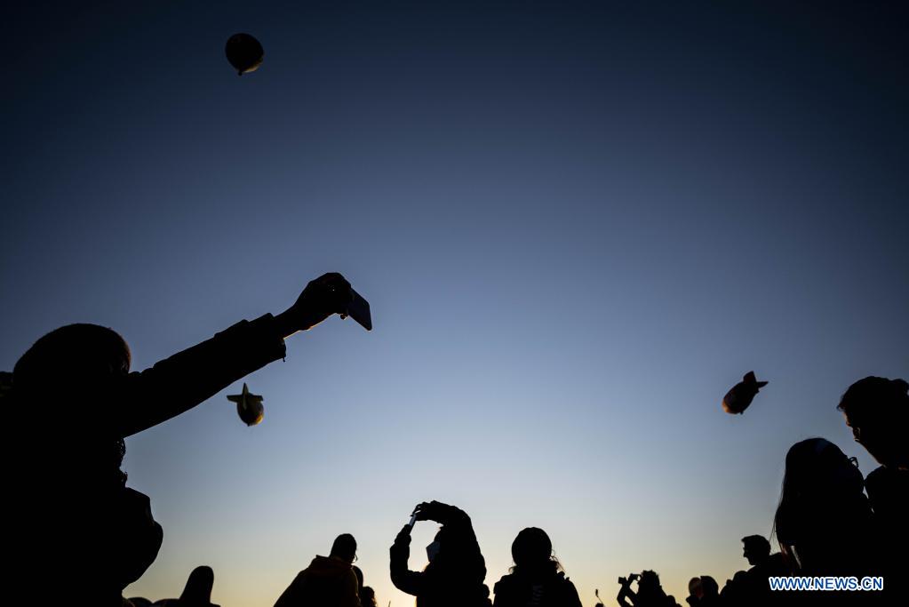 GUANAJUATO, 14 noviembre, 2021 (Xinhua) -- Personas reaccionan mientras observan globos aerostáticos despegar durante el tercer día de la 20 edición del Festival Internacional del Globo 2021, en León, en el estado de Guanajuato, México, el 14 de noviembre de 2021. Unos 200 globos aerostáticos surcan desde el viernes, y hasta el próximo lunes, el cielo de la ciudad de León, Guanajuato, un espectáculo abierto al público, tras un año suspendido a causa de la pandemia de la enfermedad del nuevo coronavirus (COVID-19). (Xinhua/David de la Paz)