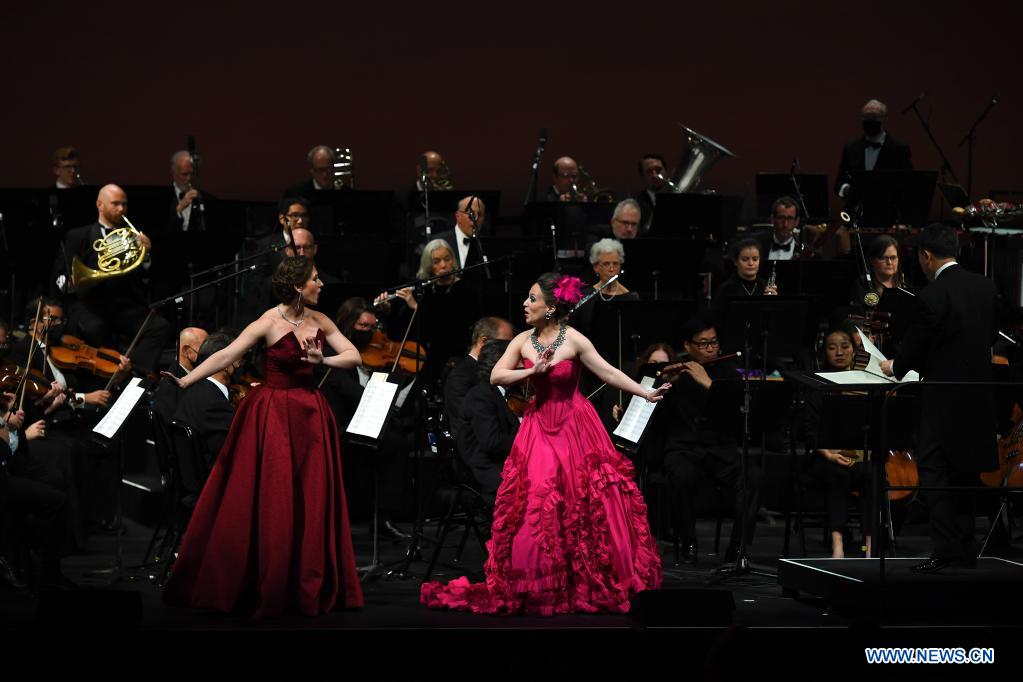 NUEVA YORK, 14 noviembre, 2021 (Xinhua) -- Imagen del 13 de noviembre de 2021 de las sopranos Esther Maureen Kelly (i-frente) y Holly Flack (d-frente), cantando durante el concierto "Este/Oeste: Una Celebración Sinfónica" en el Lincoln Center, en Nueva York, Estados Unidos. Un concierto se llevó a cabo en el Lincoln Center de la ciudad de Nueva York el sábado por la noche que deleitó a la audiencia con múltiples piezas musicales chinas. El concierto es parte de "Image China", una iniciativa de intercambio cultural presentada por el Grupo de Artes y Entretenimiento de China, que tiene el objetivo presentar artes escénicas tradicionales y contemporáneas chinas a audiencias alrededor del mundo. (Xinhua/Li Rui)
