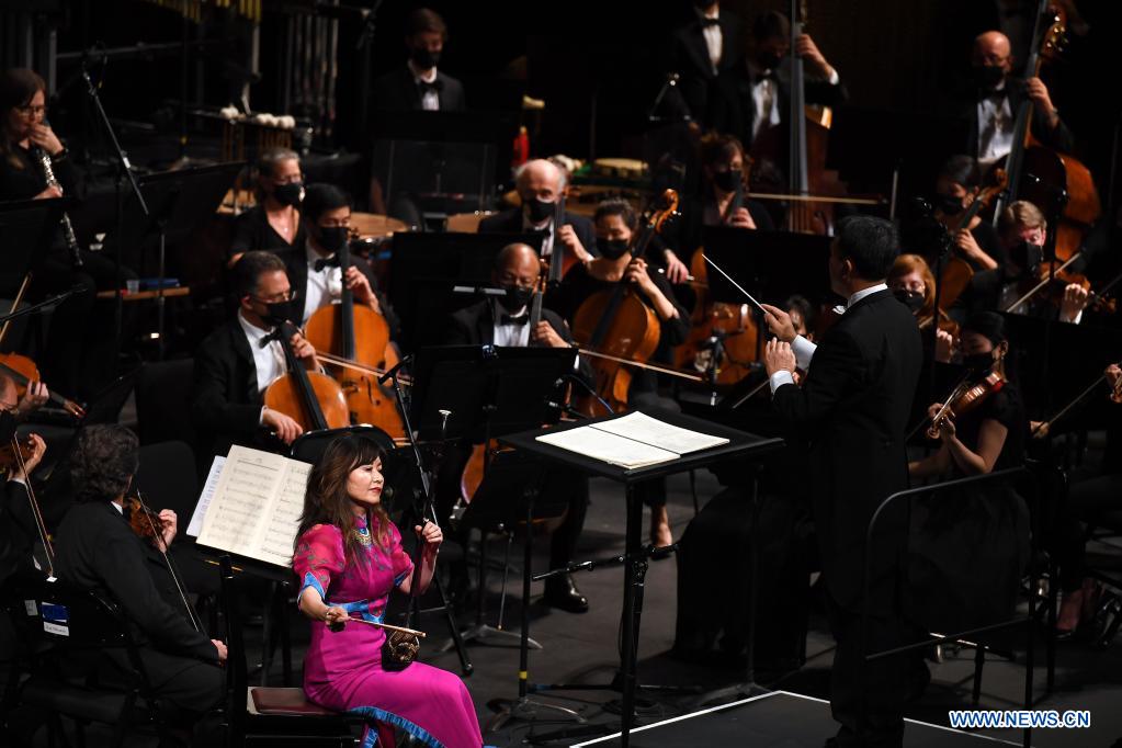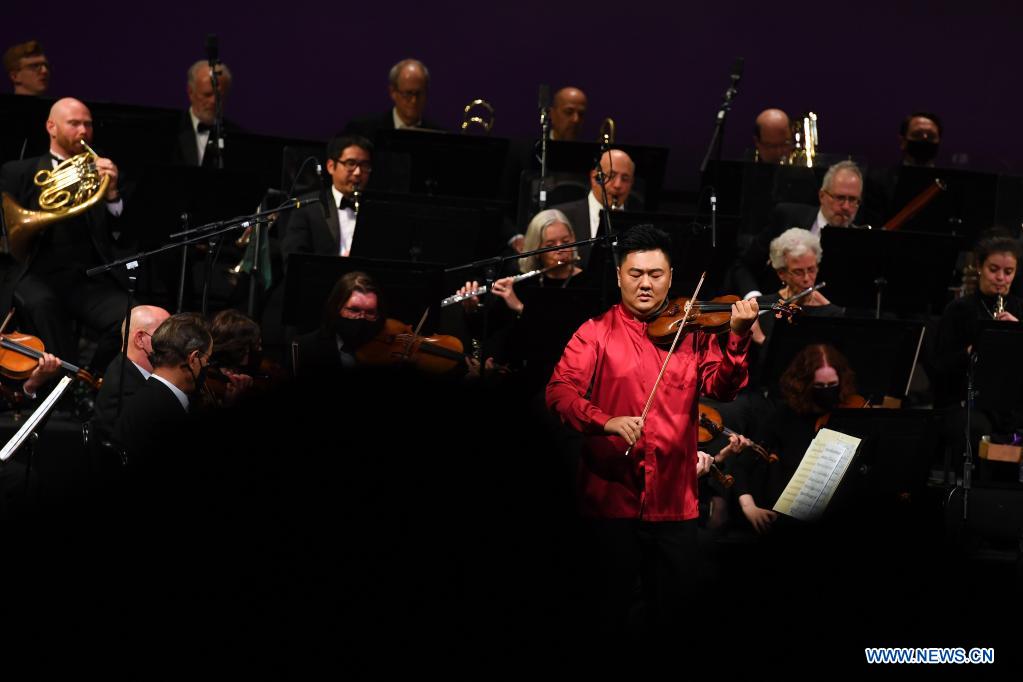 NUEVA YORK, 14 noviembre, 2021 (Xinhua) -- Imagen del 13 de noviembre de 2021 de la virtuosa del erhu, Chen Jiebing (i-frente) y la Orquesta del Ballet de la Ciudad de Nueva York, realizando una presentación durante el concierto "Este/Oeste: Una Celebración Sinfónica" en el Lincoln Center, en Nueva York, Estados Unidos. Un concierto se llevó a cabo en el Lincoln Center de la ciudad de Nueva York el sábado por la noche que deleitó a la audiencia con múltiples piezas musicales chinas. El concierto es parte de "Image China", una iniciativa de intercambio cultural presentada por el Grupo de Artes y Entretenimiento de China, que tiene el objetivo presentar artes escénicas tradicionales y contemporáneas chinas a audiencias alrededor del mundo. (Xinhua/Li Rui)