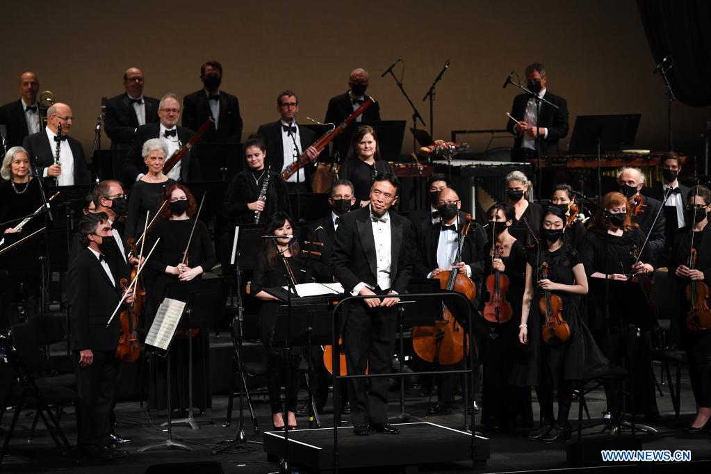 NUEVA YORK, 14 noviembre, 2021 (Xinhua) -- Imagen del 13 de noviembre de 2021 del director Cai Jindong (c) y la Orquesta del Ballet de la Ciudad de Nueva York, reaccionando durante el concierto "Este/Oeste: Una Celebración Sinfónica" en el Lincoln Center, en Nueva York, Estados Unidos. Un concierto se llevó a cabo en el Lincoln Center de la ciudad de Nueva York el sábado por la noche que deleitó a la audiencia con múltiples piezas musicales chinas. El concierto es parte de "Image China", una iniciativa de intercambio cultural presentada por el Grupo de Artes y Entretenimiento de China, que tiene el objetivo presentar artes escénicas tradicionales y contemporáneas chinas a audiencias alrededor del mundo. (Xinhua/Li Rui)