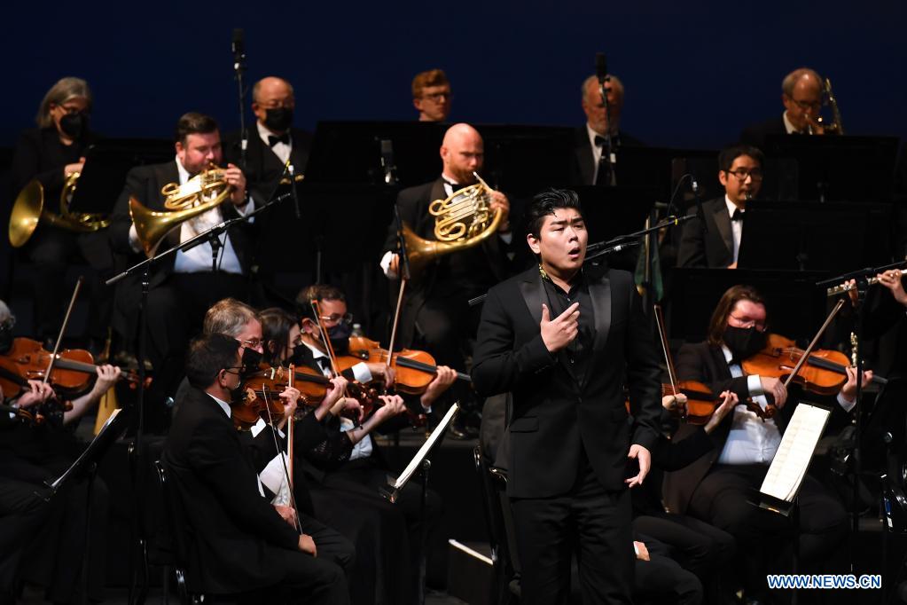 NUEVA YORK, 14 noviembre, 2021 (Xinhua) -- Imagen del 13 de noviembre de 2021 del bajo William Guambo Su (frente) cantando durante el concierto "Este/Oeste: Una Celebración Sinfónica" en el Lincoln Center, en Nueva York, Estados Unidos. Un concierto se llevó a cabo en el Lincoln Center de la ciudad de Nueva York el sábado por la noche que deleitó a la audiencia con múltiples piezas musicales chinas. El concierto es parte de "Image China", una iniciativa de intercambio cultural presentada por el Grupo de Artes y Entretenimiento de China, que tiene el objetivo presentar artes escénicas tradicionales y contemporáneas chinas a audiencias alrededor del mundo. (Xinhua/Li Rui)
