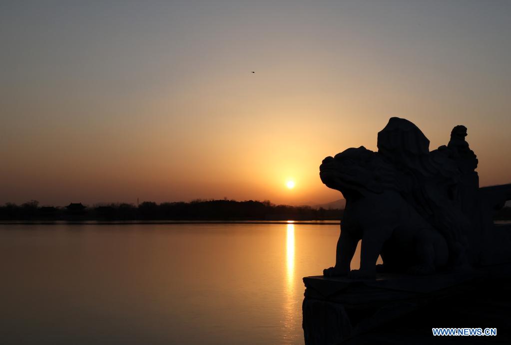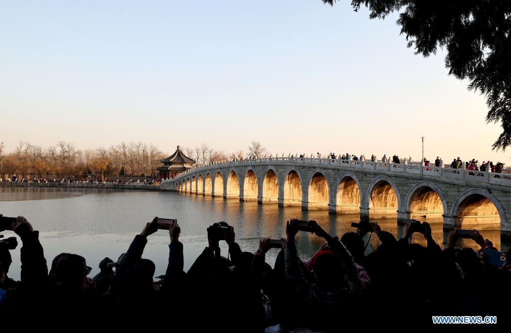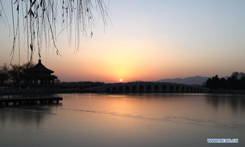 BEIJING, 25 noviembre, 2021 (Xinhua) -- Imagen del 25 de noviembre de 2021 del atardecer iluminando los arcos del Puente de los 17 Arcos en el Palacio de Verano, en Beijing, capital de China. (Xinhua/Chen Jianli)