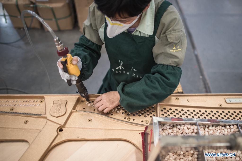 YICHANG, 28 noviembre, 2021 (Xinhua) -- Imagen del 23 de noviembre de 2021 de un trabajador ensamblando un piano en una fábrica de producción de Parsons Music Corporation, en Yichang, en la provincia de Hubei, en el centro de China. La fábrica de producción de Parsons Music Corporation en Yichang es una de las mayores bases de fabricación de pianos del mundo. Más de 2.000 fabricantes de pianos procesan, ajustan y ensamblan cuidadosamente los pianos para traer alegría musical al mundo. (Xinhua/Xiao Yijiu)