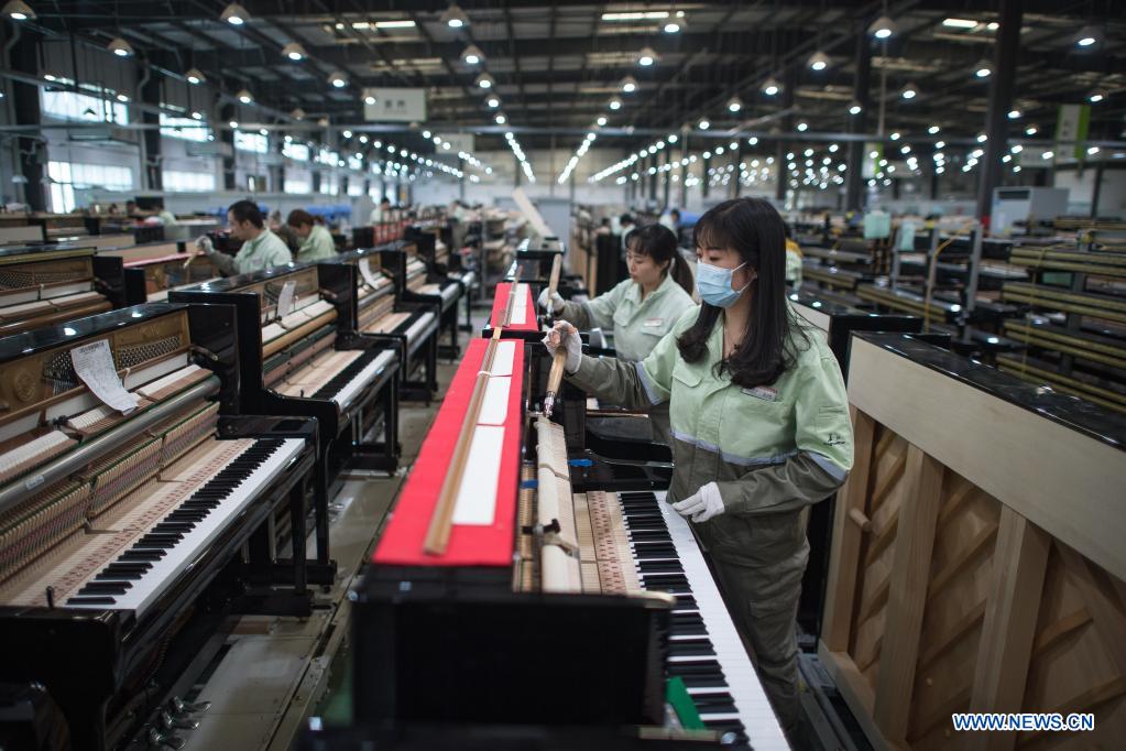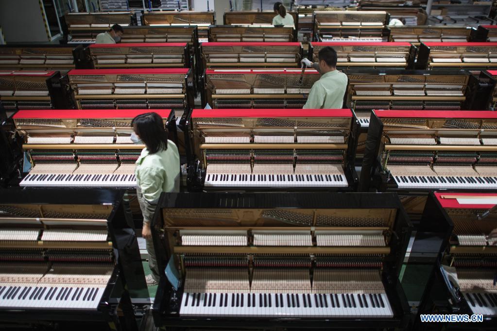YICHANG, 28 noviembre, 2021 (Xinhua) -- Imagen del 23 de noviembre de 2021 de trabajadores afinando pianos en una fábrica de producción de Parsons Music Corporation, en Yichang, en la provincia de Hubei, en el centro de China. La fábrica de producción de Parsons Music Corporation en Yichang es una de las mayores bases de fabricación de pianos del mundo. Más de 2.000 fabricantes de pianos procesan, ajustan y ensamblan cuidadosamente los pianos para traer alegría musical al mundo. (Xinhua/Xiao Yijiu)