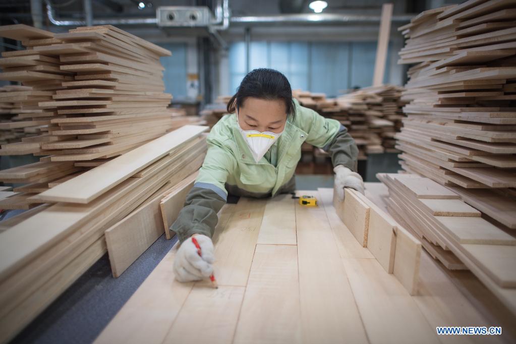 YICHANG, 28 noviembre, 2021 (Xinhua) -- Imagen del 23 de noviembre de 2021 de una trabajadora marcando madera para piano en una fábrica de producción de Parsons Music Corporation, en Yichang, en la provincia de Hubei, en el centro de China. La fábrica de producción de Parsons Music Corporation en Yichang es una de las mayores bases de fabricación de pianos del mundo. Más de 2.000 fabricantes de pianos procesan, ajustan y ensamblan cuidadosamente los pianos para traer alegría musical al mundo. (Xinhua/Xiao Yijiu)