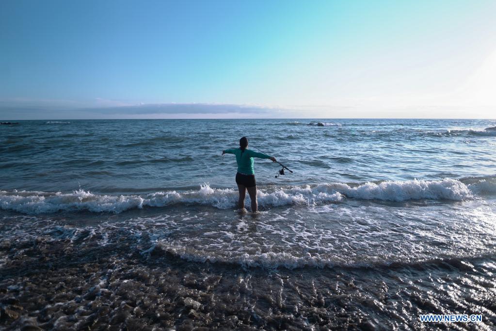PEDASI, 28 noviembre, 2021 (Xinhua) -- Una mujer pesca en la playa El Toro, en el poblado de Pedasí, provincia de Los Santos, Panamá, el 28 de noviembre del 2021. (Xinhua/Mauricio Valenzuela)