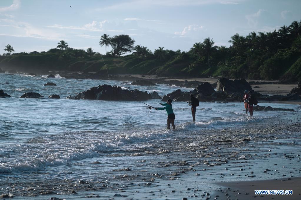 PEDASI, 28 noviembre, 2021 (Xinhua) -- Personas pescan en la playa El Toro, en el poblado de Pedasí, provincia de Los Santos, Panamá, el 28 de noviembre del 2021. (Xinhua/Mauricio Valenzuela)