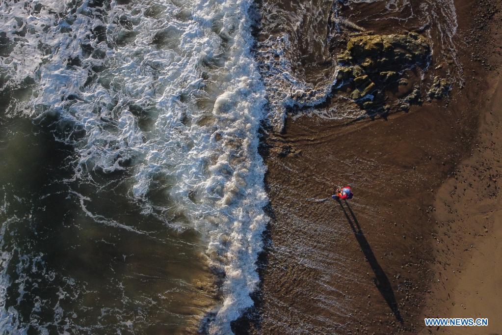 PEDASI, 28 noviembre, 2021 (Xinhua) -- Imagen tomada con un dron de un hombre pescando en la playa El Toro, en el poblado de Pedasí, provincia de Los Santos, Panamá, el 28 de noviembre del 2021. (Xinhua/Mauricio Valenzuela)