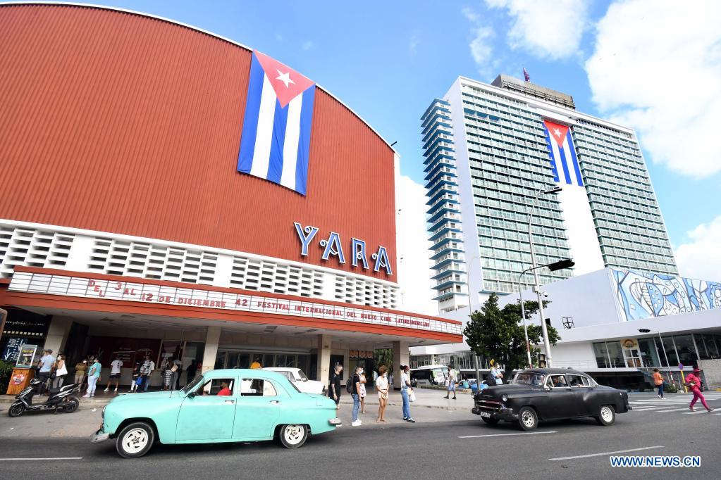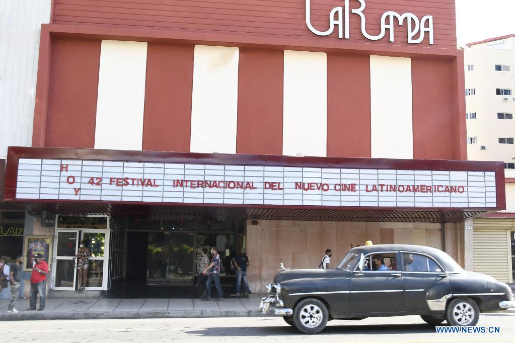 LA HABANA, 3 diciembre, 2021 (Xinhua) -- Un automóvil antiguo circula frente al Cine La Rampa, donde se exhiben películas de la edición 42 del Festival del Nuevo Cine Latinoamericano, en La Habana, capital de Cuba, el 3 de diciembre de 2021. Un centenar de películas comenzaron a competir el viernes, y durante una semana, por los codiciados Premios Coral en la segunda parte de la edición 42 del Festival del Nuevo Cine Latinoamericano, realizada en dos partes como consecuencia de la enfermedad del nuevo coronavirus (COVID-19). (Xinhua/Joaquín Hernández)