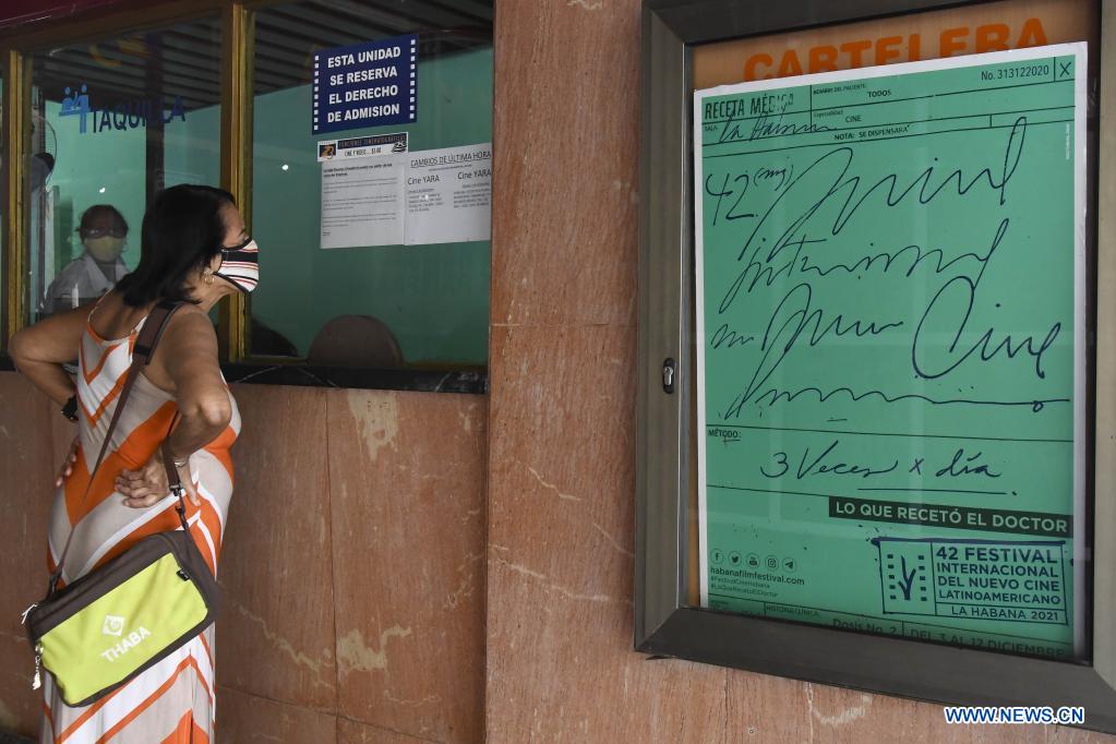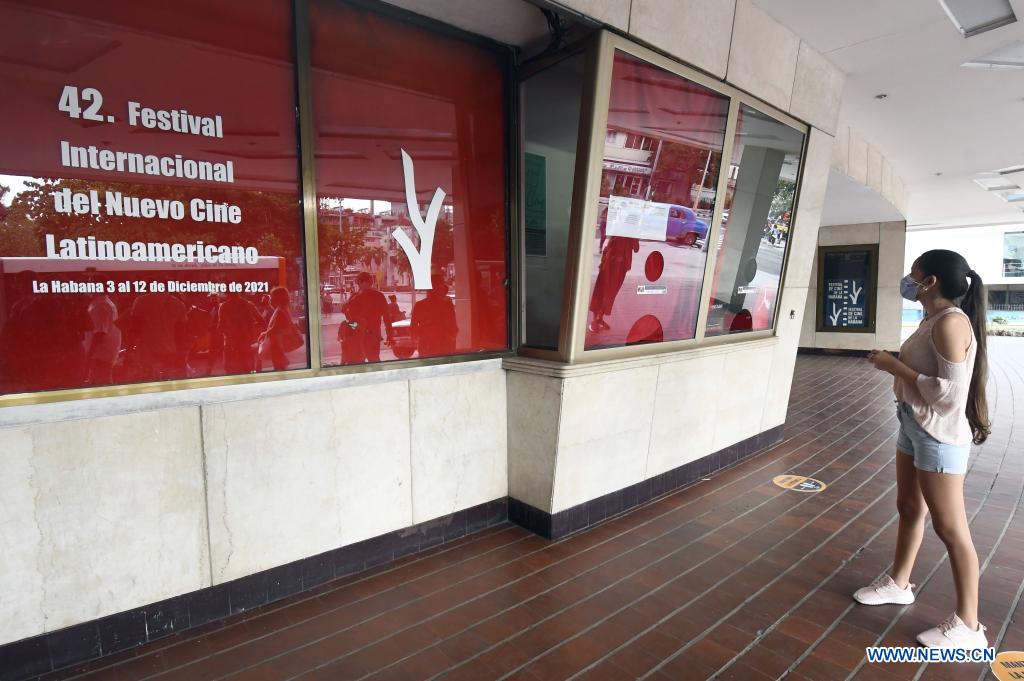LA HABANA, 3 diciembre, 2021 (Xinhua) -- Una mujer lee la cartelera en el Cine La Rampa, donde se exhiben películas de la edición 42 del Festival del Nuevo Cine Latinoamericano, en La Habana, capital de Cuba, el 3 de diciembre de 2021. Un centenar de películas comenzaron a competir el viernes, y durante una semana, por los codiciados Premios Coral en la segunda parte de la edición 42 del Festival del Nuevo Cine Latinoamericano, realizada en dos partes como consecuencia de la enfermedad del nuevo coronavirus (COVID-19). (Xinhua/Joaquín Hernández)