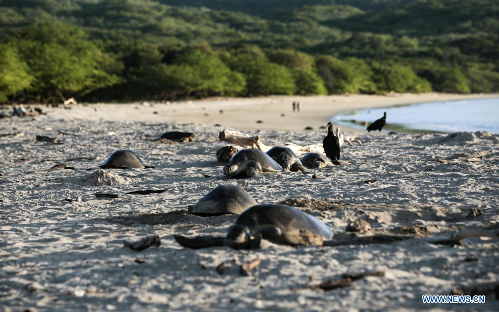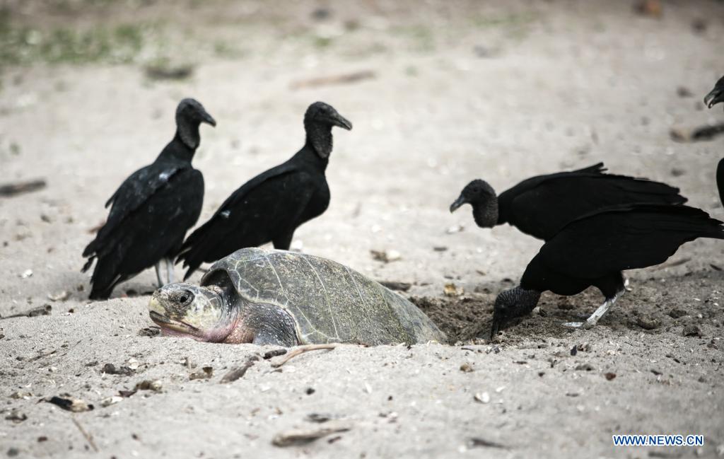 SAN JUAN DEL SUR, 5 noviembre, 2021 (Xinhua) -- Buitres observan a una tortuga paslama en la Reserva Natural Playa La Flor, en San Juan del Sur, Nicaragua, el 5 de diciembre de 2021. La Reserva Natural Playa La Flor es un santuario natural donde las tortugas paslama arriban masivamente 7 veces al año para desovar entre los meses de julio a enero. (Xinhua/Oswaldo Rivas)