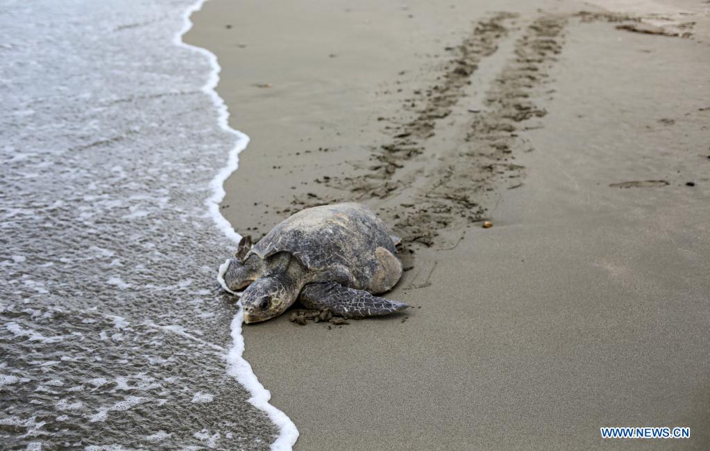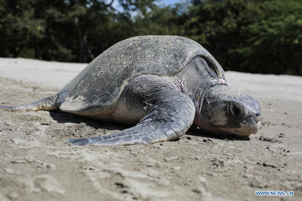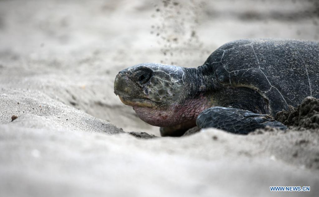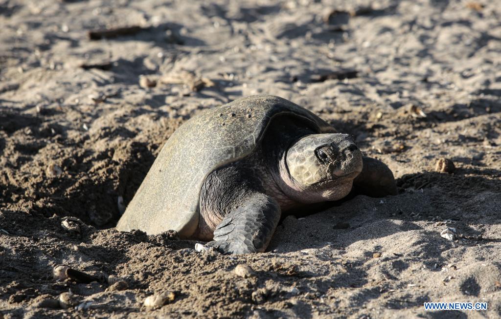 SAN JUAN DEL SUR, 5 noviembre, 2021 (Xinhua) -- Una tortuga paslama arriba a la Reserva Natural Playa La Flor para desovar, en San Juan del Sur, Nicaragua, el 5 de diciembre de 2021. La Reserva Natural Playa La Flor es un santuario natural donde las tortugas paslama arriban masivamente 7 veces al año para desovar entre los meses de julio a enero. (Xinhua/Oswaldo Rivas)