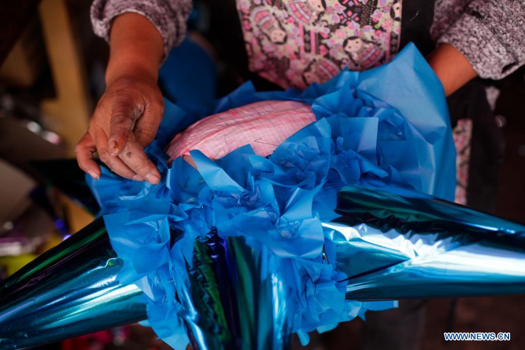 CIUDAD DE MEXICO, 6 diciembre, 2021 (Xinhua) -- La artesana Sandra García elabora una piñata tradicional de olla de barro para su venta en la temporada navideña en un taller temporal en las afueras del mercado de Sonora, en la Ciudad de México, capital de México, el 6 de diciembre de 2021. (Xinhua/Francisco Cañedo)