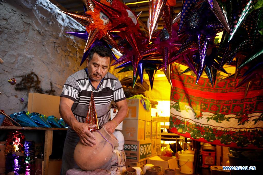 CIUDAD DE MEXICO, 6 diciembre, 2021 (Xinhua) -- Un hombre elabora una piñata tradicional de olla de barro para su venta en la temporada navideña en un taller temporal en las afueras del mercado de Sonora, en la Ciudad de México, capital de México, el 6 de diciembre de 2021. (Xinhua/Francisco Cañedo)