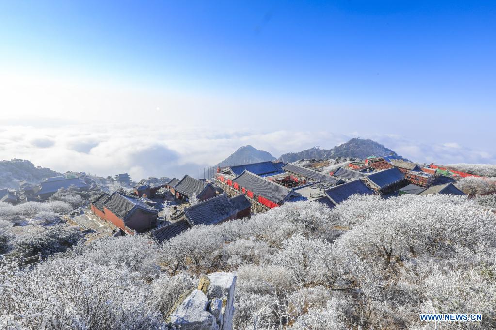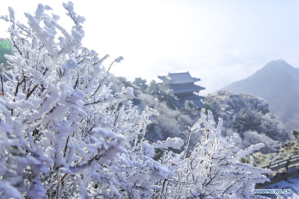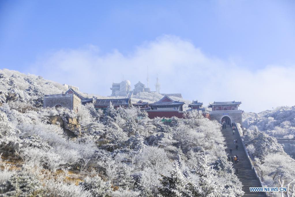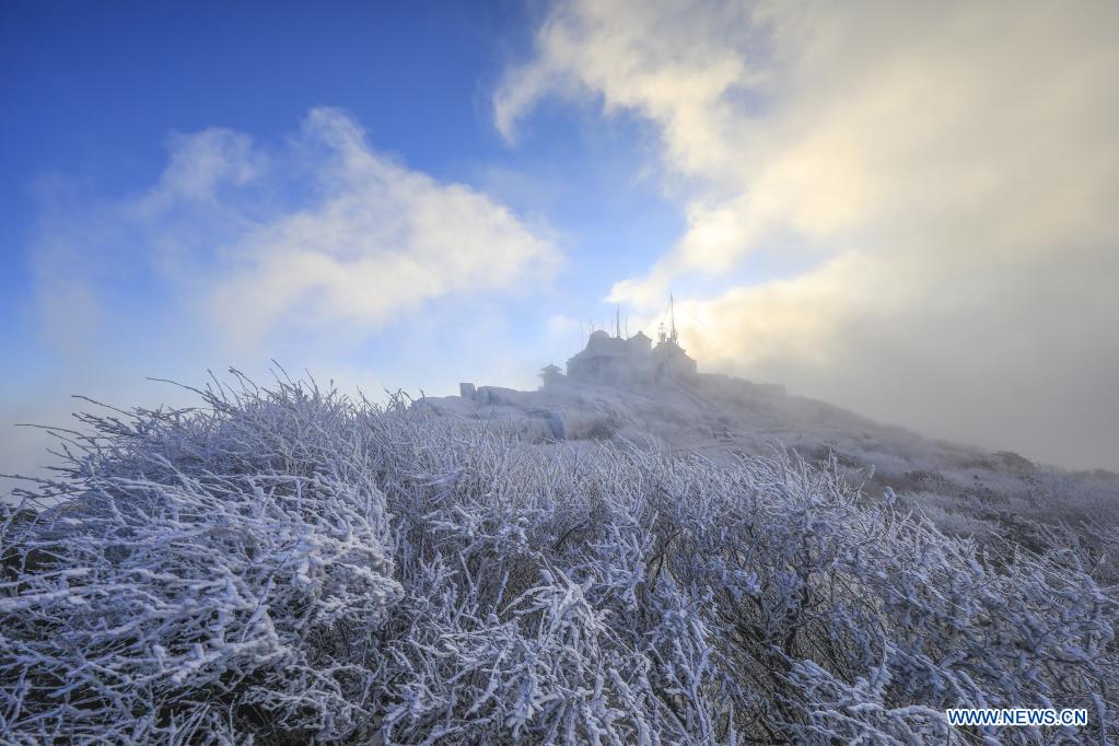 JINAN, 15 diciembre, 2021 (Xinhua) -- Imagen del 14 de diciembre de 2021 de árboles cubiertos de escarcha en la montaña Taishan, en Tai'an, en la provincia de Shandong, en el este de China. (Xinhua/Cheng Xianhao)