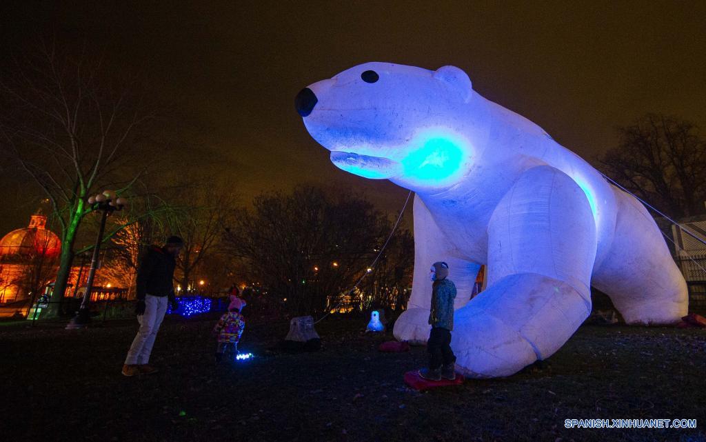 TORONTO, 16 diciembre, 2021 (Xinhua) -- Imagen del 15 de diciembre de 2021 de personas observando un oso polar inflable durante el Festival de Invierno Polar, en Toronto, Canadá. Como experiencia navideña al aire libre, este festival inmersivo se celebra en Toronto del 25 de noviembre al 26 de diciembre de este año. (Xinhua/Zou Zheng)