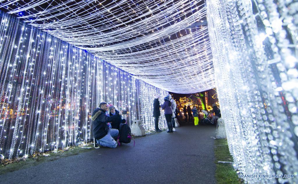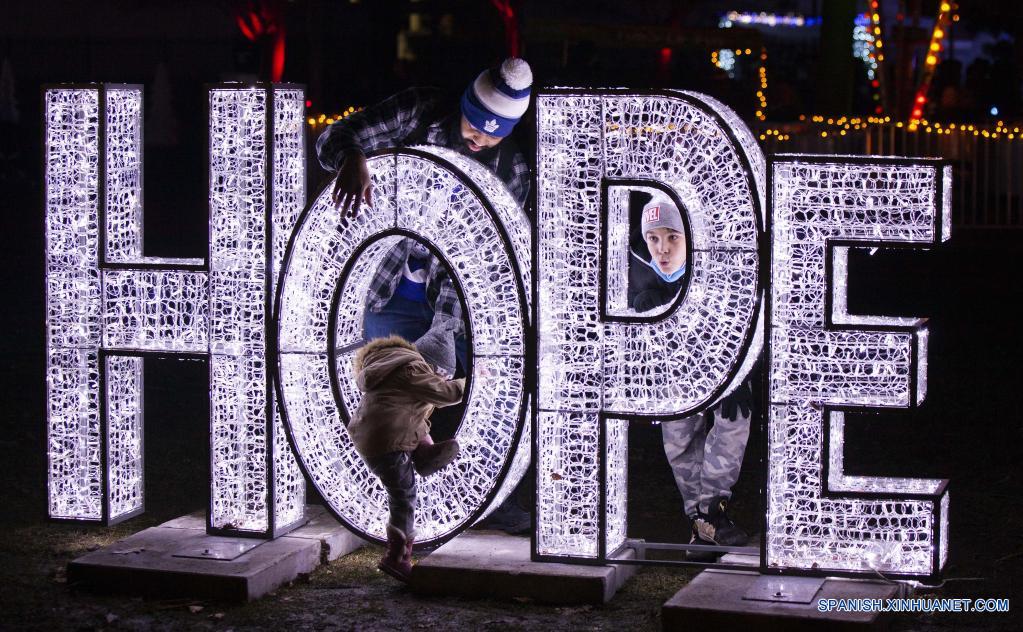 TORONTO, 16 diciembre, 2021 (Xinhua) -- Imagen del 15 de diciembre de 2021 de personas jugando en una instalación de luz durante el Festival de Invierno Polar, en Toronto, Canadá. Como experiencia navideña al aire libre, este festival inmersivo se celebra en Toronto del 25 de noviembre al 26 de diciembre de este año. (Xinhua/Zou Zheng)
