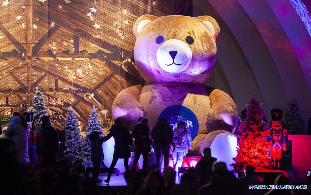 TORONTO, 16 diciembre, 2021 (Xinhua) -- Imagen del 15 de diciembre de 2021 de personas caminando frente a un enorme osito de peluche durante el Festival de Invierno Polar, en Toronto, Canadá. Como experiencia navideña al aire libre, este festival inmersivo se celebra en Toronto del 25 de noviembre al 26 de diciembre de este año. (Xinhua/Zou Zheng)