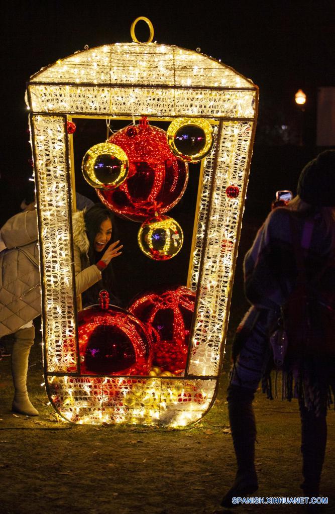 TORONTO, 16 diciembre, 2021 (Xinhua) -- Imagen del 15 de diciembre de 2021 de una mujer posando con una instalación de luz durante el Festival de Invierno Polar, en Toronto, Canadá. Como experiencia navideña al aire libre, este festival inmersivo se celebra en Toronto del 25 de noviembre al 26 de diciembre de este año. (Xinhua/Zou Zheng)