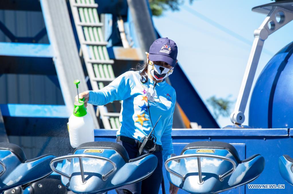 SAN JOSE, 29 diciembre, 2021 (Xinhua) -- Elena Mendoza, colaboradora del parque, realiza trabajos de desinfección de los juegos previo a su uso, rutina que se repite en cada ronda de participantes, en el Parque Nacional de Diversiones, en el distrito de La Uruca, en San José, Costa Rica, el 29 de diciembre de 2021. El parque de diversiones inició su reapertura el miércoles bajo estrictos protocolos de salud aprobados por las autoridades del Ministerio de Salud del país luego de 20 meses de permanecer cerrado. (Xinhua/Esteban Dato)