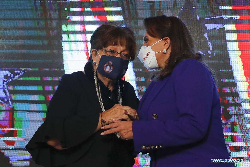 TEGUCIGALPA, 30 diciembre, 2021 (Xinhua) -- Xiomara Castro (d), posa con su designada presidencial Doris Gutiérrez (i), durante la ceremonia de entrega por parte del Consejo Nacional Electoral (CNE) de la credencial que la acredita como la presidenta electa de Honduras, en un hotel, en Tegucigalpa, Honduras, el 30 de diciembre de 2021. El CNE de Honduras entregó el jueves a Xiomara Castro la credencial que la acredita como presidenta electa del país, al vencer en los comicios del 28 de noviembre anterior. (Xinhua/Rafael Ochoa)