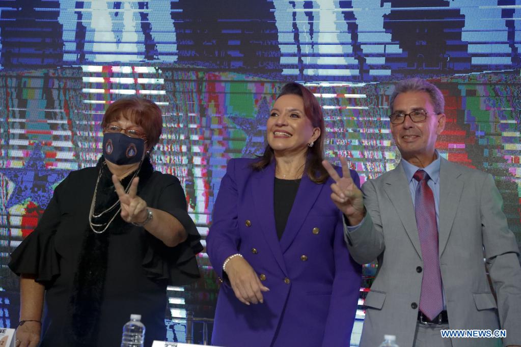 TEGUCIGALPA, 30 diciembre, 2021 (Xinhua) -- Xiomara Castro (c), y sus designados presidenciales Doris Gutiérrez (i) y Renato Florentino Pineda (d), posa durante la ceremonia de entrega por parte del Consejo Nacional Electoral (CNE) de la credencial que la acredita como la presidenta electa de Honduras, en un hotel, en Tegucigalpa, Honduras, el 30 de diciembre de 2021. El CNE de Honduras entregó el jueves a Xiomara Castro la credencial que la acredita como presidenta electa del país, al vencer en los comicios del 28 de noviembre anterior. (Xinhua/Rafael Ochoa)