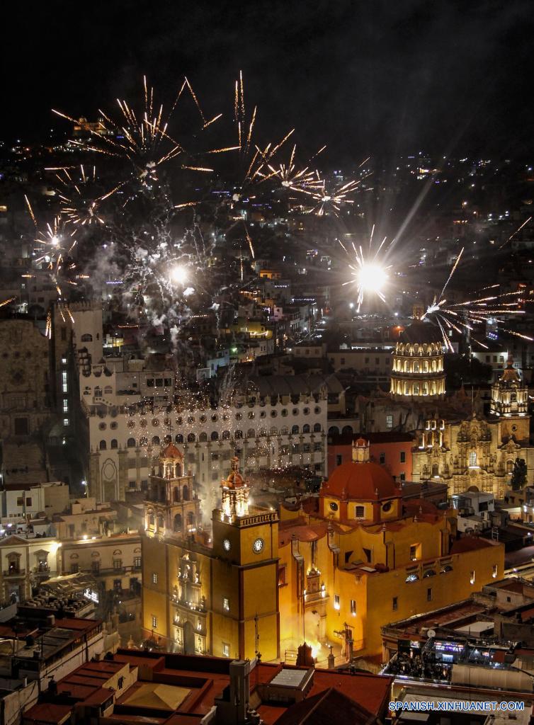 GUANAJUATO, 1 enero, 2022 (Xinhua) -- Imagen del 1 de enero de 2022 de fuegos artificiales durante la celebración de Año Nuevo, en Guanajuato, México. (Xinhua/Mario Armas)
