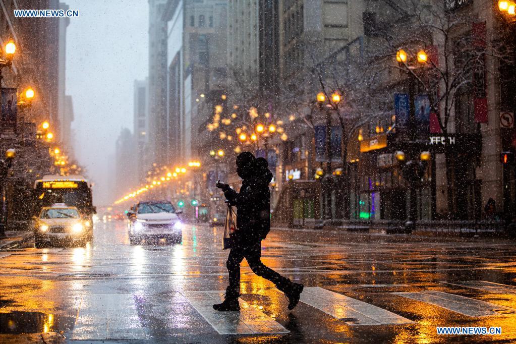 CHICAGO, 2 enero, 2022 (Xinhua) -- Imagen del 1 de enero de 2022 de un hombre cruzando la State Street, en el centro de Chicago, Estados Unidos. Una tormenta invernal azotó el sábado a Chicago, y se espera que la acumulación de nieve alcance entre 10 y 18 centímetros. (Xinhua/Vincent D. Johnson)
