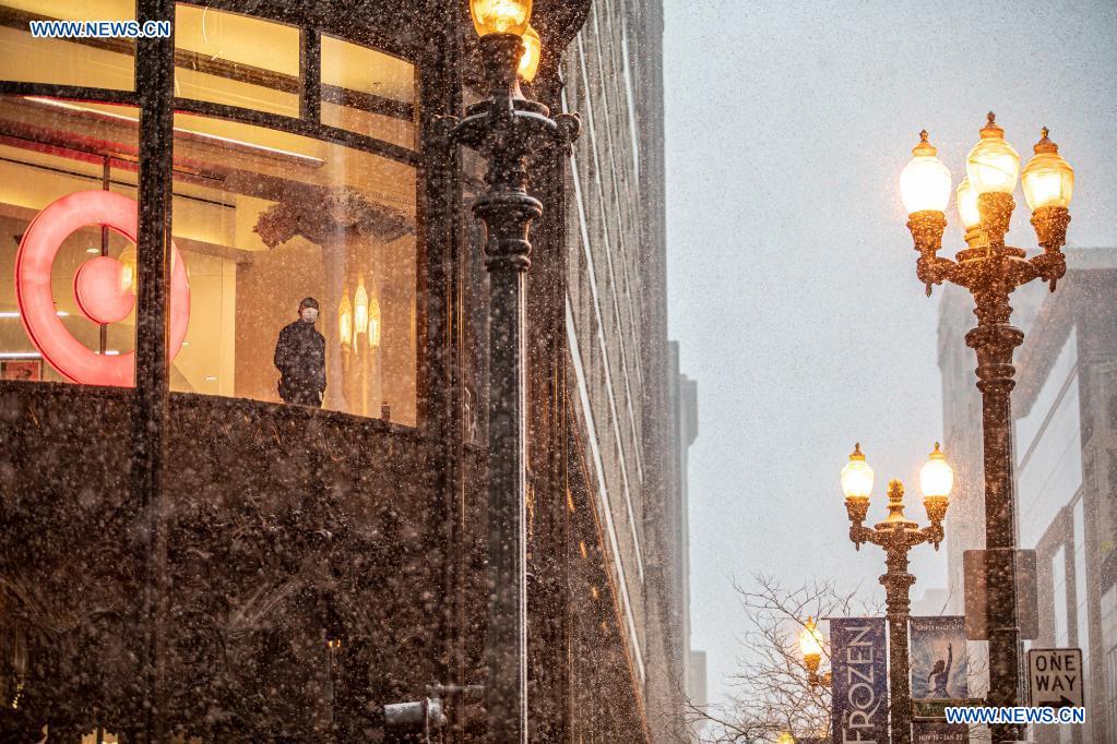 CHICAGO, 2 enero, 2022 (Xinhua) -- Imagen del 1 de enero de 2022 de un hombre en una tienda, en el centro de Chicago, Estados Unidos. Una tormenta invernal azotó el sábado a Chicago, y se espera que la acumulación de nieve alcance entre 10 y 18 centímetros. (Xinhua/Vincent D. Johnson)