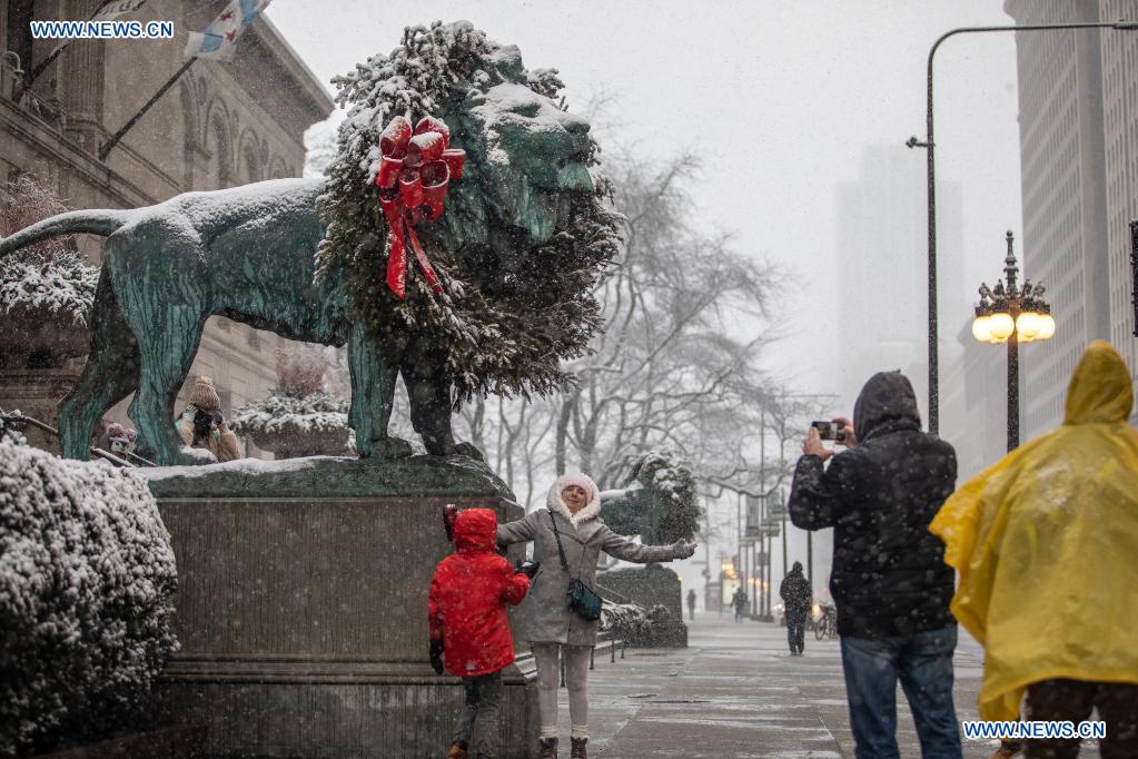CHICAGO, 2 enero, 2022 (Xinhua) -- Imagen del 1 de enero de 2022 de una mujer posando frente al león del Instituto de Arte de Chicago, en el centro de Chicago, Estados Unidos. Una tormenta invernal azotó el sábado a Chicago, y se espera que la acumulación de nieve alcance entre 10 y 18 centímetros. (Xinhua/Vincent D. Johnson)