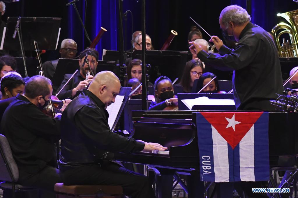 LA HABANA, 24 enero, 2022 (Xinhua) -- Imagen del 23 de enero de 2022 del músico cubano Ignacio "Nachito" Herrera (c) acompañado de la Orquesta Sinfónica Nacional presentándose durante la clausura de la 37ª edición del Festival Internacional "Jazz Plaza", en La Habana, capital de Cuba. La 37ª edición del Festival Internacional "Jazz Plaza" concluyó el domingo en la noche con un concierto en la sala Covarrubias del Teatro Nacional de Cuba en La Habana. (Xinhua/Joaquín Hernández)