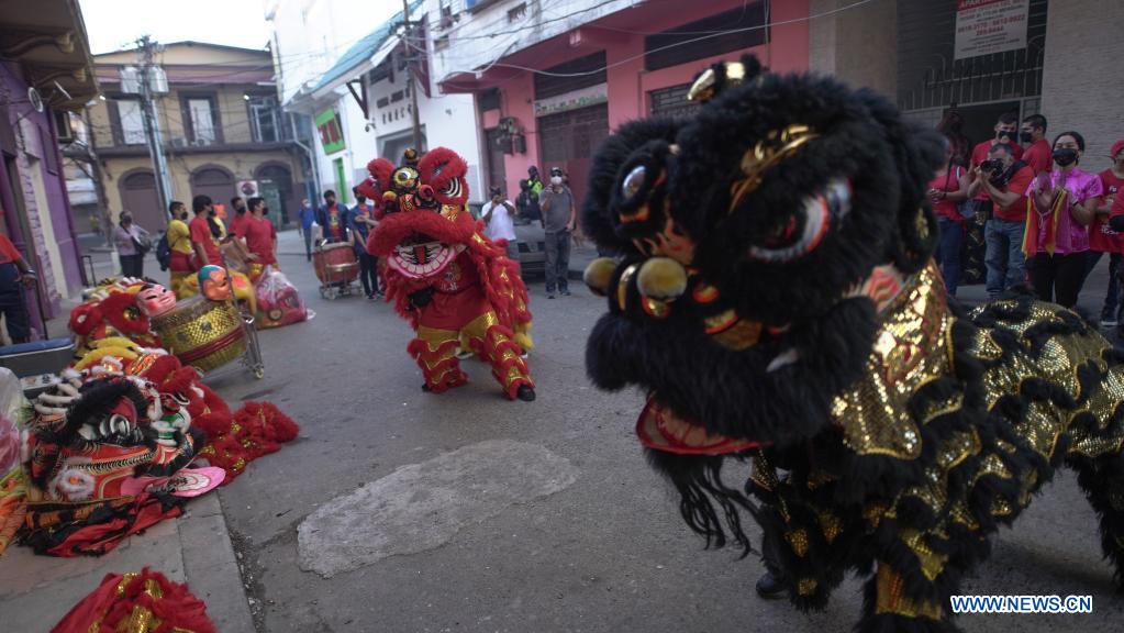 CIUDAD DE PANAMA, 1 febrero, 2022 (Xinhua) -- Bailarines participan en la celebración del Año Nuevo Lunar chino en el antiguo Barrio Chino, en la Ciudad de Panamá, capital de Panamá, el 1 de febrero de 2022. A partir del martes se iniciaron varios actos culturales por la celebración del Festival de la Primavera, también conocido como el Año Nuevo Lunar y reconocido por Panamá por primera vez un "evento país". (Xinhua/Mauricio Valenzuela)