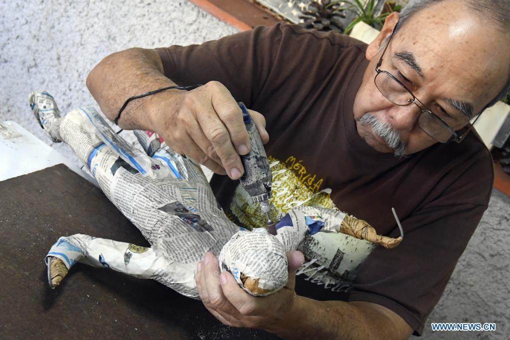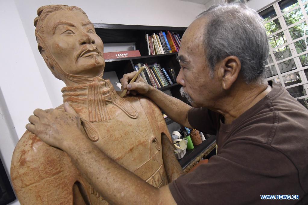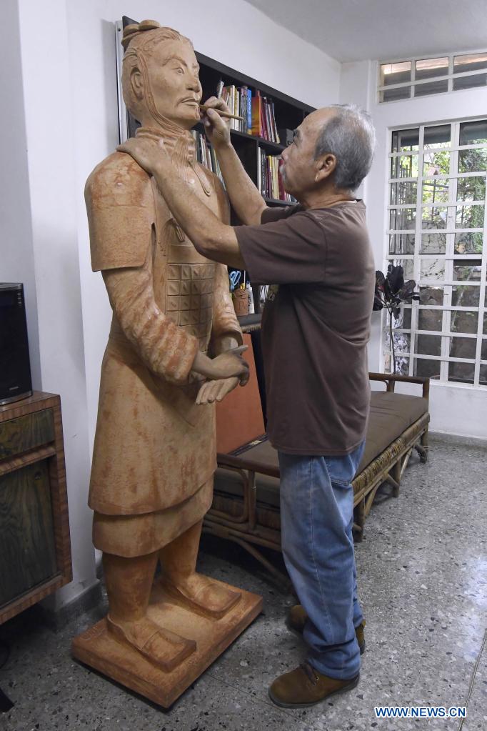 LA HABANA, 11 febrero, 2022 (Xinhua) -- Imagen del 10 de febrero de 2022 del pintor y escultor cubano Alfredo Chong, de 74 años de edad, trabajando en la réplica de un guerrero de terracota en la sala de su casa, en La Habana, capital de Cuba. La réplica de un guerrero de terracota, elaborada por Alfredo Chong, quedó emplazada en la sede del Instituto Confucio de La Habana, en pleno corazón del Barrio Chino de la capital de Cuba, y ahora resguarda de manera simbólica esa institución docente. (Xinhua/Joaquín Hernández)