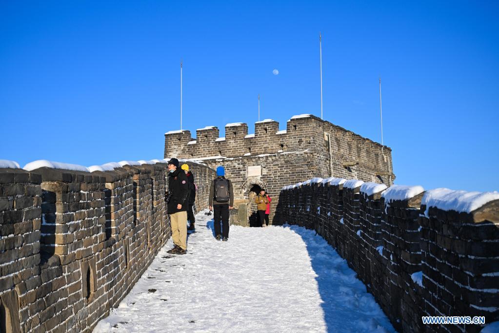 BEIJING, 15 febrero, 2022 (Xinhua) -- Imagen del 14 de febrero de 2022 de turistas observando el paisaje nevado de la sección Mutianyu de la Gran Muralla, en Beijing, capital de China. (Xinhua/Chen Yehua)