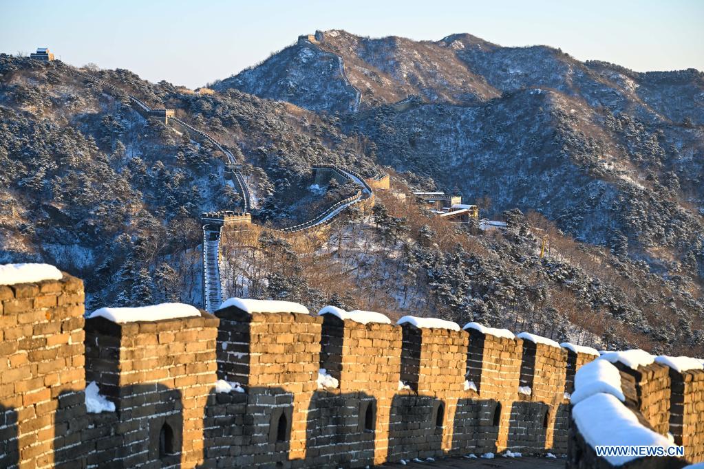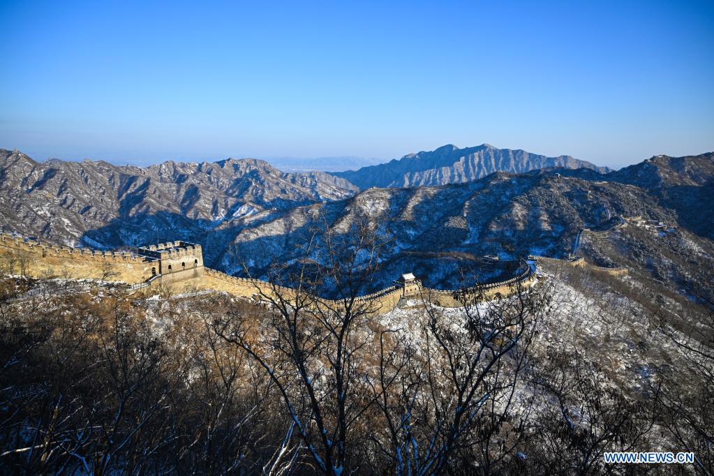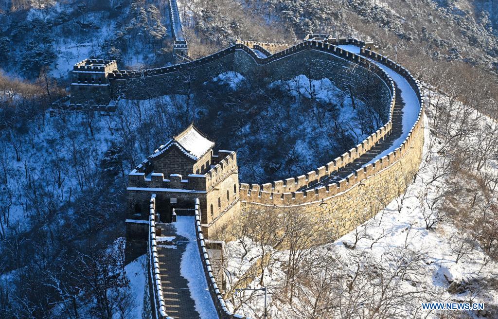 BEIJING, 15 febrero, 2022 (Xinhua) -- Imagen del 14 de febrero de 2022 del paisaje nevado de la sección Mutianyu de la Gran Muralla en Beijing, capital de China. (Xinhua/Chen Yehua)