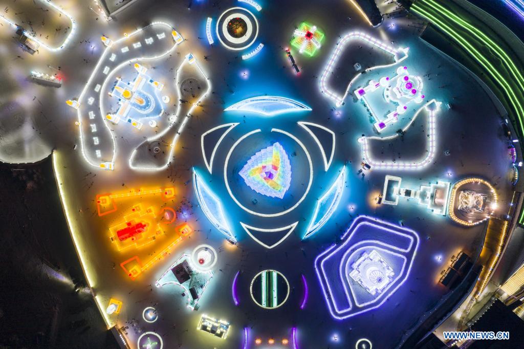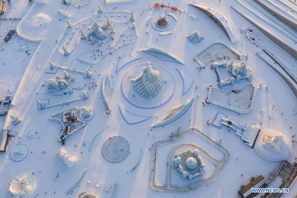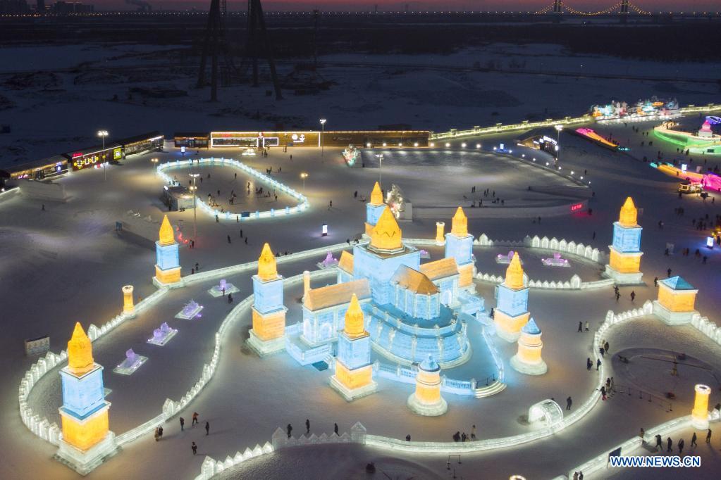 HARBIN, 27 febrero, 2022 (Xinhua) -- Vista aérea de turistas visitando el Mundo de Hielo y Nieve de Harbin, en Harbin, provincia de Heilongjiang, en el noreste de China, el 27 de febrero de 2022. El 23° Mundo de Hielo y Nieve de Harbin cerró el domingo. (Xinhua/Zhang Tao)