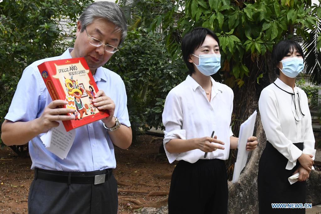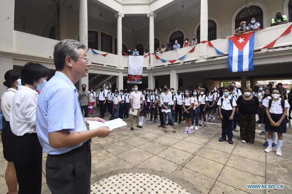 LA HABANA, 8 marzo, 2022 (Xinhua) -- Imagen del 7 de marzo de 2022 del embajador de China en Cuba, Ma Hui (i), mostrando un libro durante el acto de inauguración del curso escolar 2021-2022 en la escuela secundaria Fructuoso Rodríguez, en el barrio del Vedado, en La Habana, capital de Cuba. El sistema educacional cubano comenzó el lunes a introducir el idioma chino como segunda lengua optativa en la enseñanza secundaria, en cumplimiento de un acuerdo entre los Ministerios de Educación de China y Cuba. (Xinhua/Joaquín Hernández)