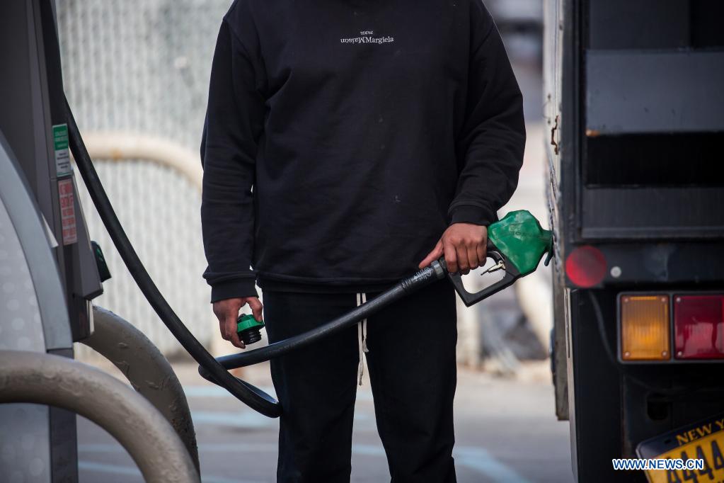 NUEVA YORK, 9 marzo, 2022 (Xinhua) -- Imagen del 8 de marzo de 2022 de una persona bombeando combustible en una estación de servicio, en el barrio de Brooklyn de Nueva York, Estados Unidos. El precio promedio nacional en Estados Unidos de un galón (3,78 litros) de gasolina regular alcanzó el miércoles un nuevo récord de 4,173 dólares, de acuerdo con datos de la Asociación Estadounidense del Automóvil. El precio promedio nacional de la gasolina subió 55 centavos en la última semana, luego de un incremento en el precio del petróleo y superó el récord anterior de 4,114 dólares el galón establecido en julio de 2008. El récord actual no considera la inflación. (Xinhua/Michael Nagle)