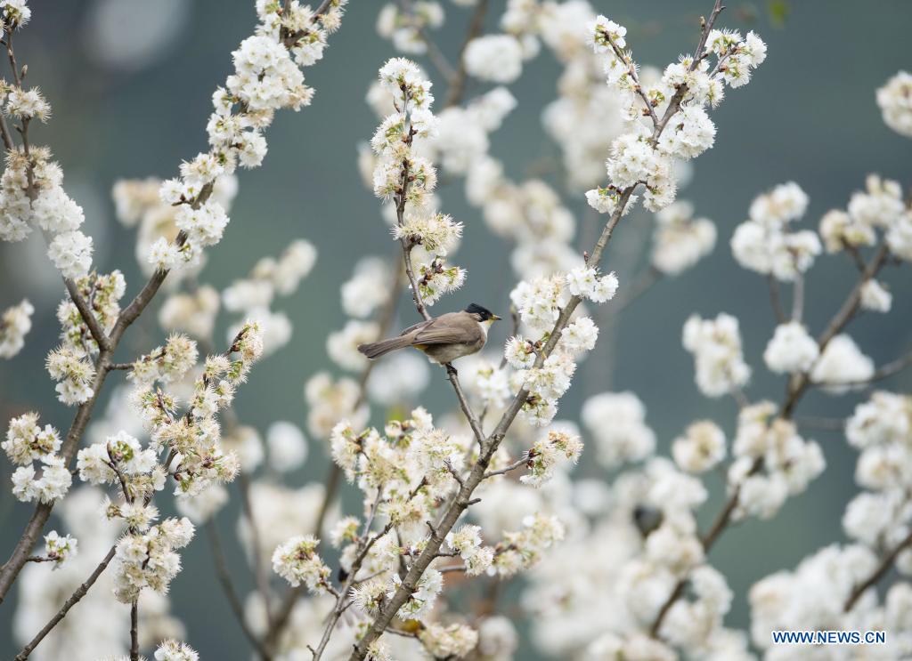 GUIYANG, 11 marzo, 2022 (Xinhua) -- Imagen del 10 de marzo de 2022 de un ave posada sobre la rama de un árbol floreciendo, en el Parque de Humedales Urbano del río Xiaoche, en Guiyang, capital de la provincia de Guizhou, en el suroeste de China. (Xinhua/Deng Gang)