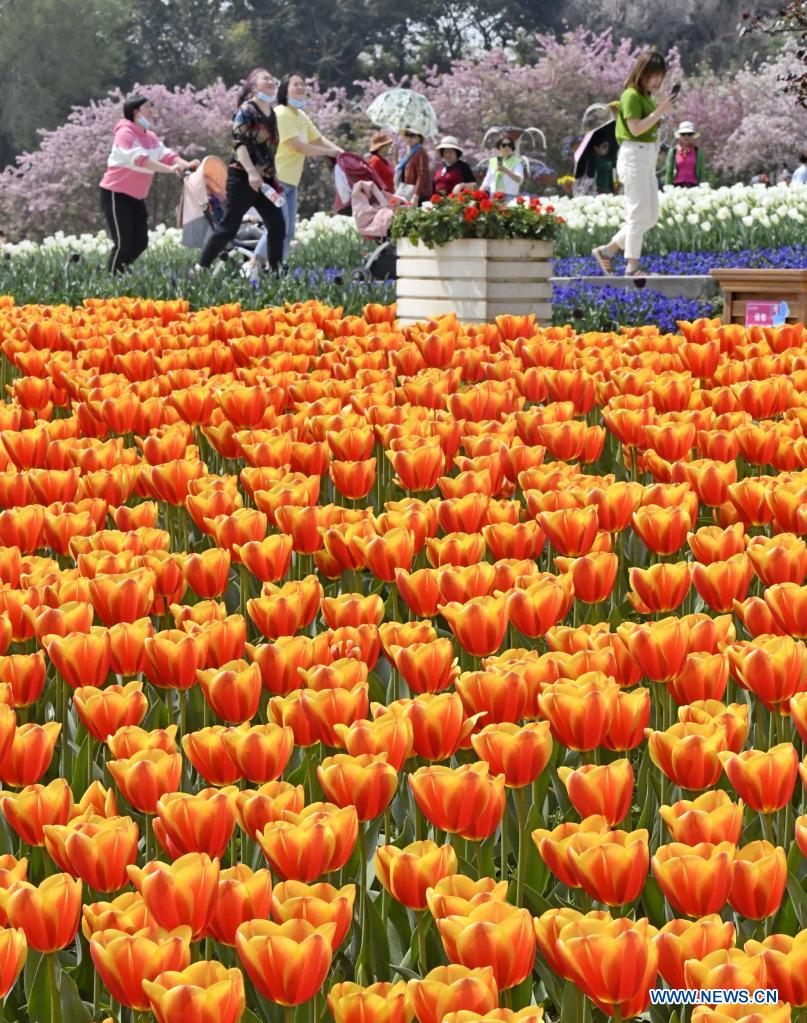 SICHUAN, 11 marzo, 2022 (Xinhua) -- Imagen del 10 de marzo de 2022 de personas observando las flores floreciendo, en Chengdu, en la provincia de Sichuan, en el suroeste de China. (Xinhua/Li Xiangyu)