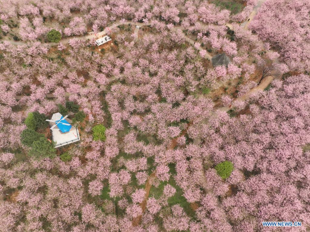 HENGYANG, 12 marzo, 2022 (Xinhua) -- Vista aérea del 11 de marzo de 2022 de flores de cerezo en el municipio de Luoqiao de la ciudad de Changning, en la provincia de Hunan, en el centro de China. (Xinhua/Zhao Zhongzhi)